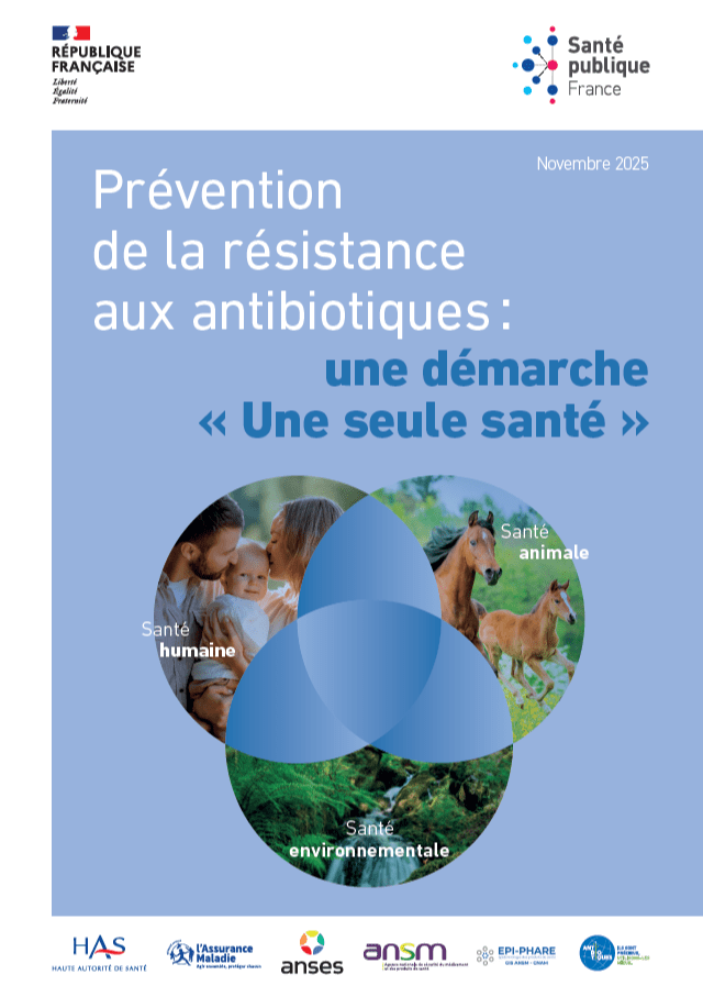 La lutte contre l'antibiorésistance se mène à plusieurs échelles – internationale, nationale, régionale, locale – et sur de multiples fronts : recherche, surveillance des résistances et de leur évolution, prévention des infections et promotion d'un usage raisonné des antibiotiques. Depuis plusieurs années, des actions sont déployées en santé humaine, animale et dans l'environnement. Cependant, une approche cloisonnée n'est plus suffisante : les politiques publiques et les initiatives scientifiques tendent à s'inscrire dans une vision plus globale et interconnectée entre secteurs, portée par le concept " Une seule santé " ou One health. Malgré les progrès accomplis, des efforts supplémentaires restent indispensables pour renforcer la cohérence entre les secteurs et maximiser l'impact des actions engagées. Cette synthèse dresse un état des lieux des principaux résultats de surveillance et des actions de prévention mises en œuvre en France, qu'il s'agisse de prévention des infections ou du bon usage des antibiotiques. Elle met en lumière les initiatives menées dans trois domaines – santé humaine, santé animale et environnement – et souligne l'importance d'une mobilisation continue pour préserver l'efficacité des traitements antibactériens.